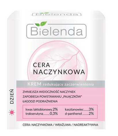 Bielenda Cera Naczynkowa - krem redukujący zaczerwienienia na dzień to preparat o skoncentrowanym działaniu, który przeciwdziała tworzeniu się nowych „pajączków” oraz chroni skórę przed szkodliwym wpływem czynników zewnętrznych, redukuje zaczerwienienia skóry oraz widoczność rozszerzonych naczyń krwionośnych, wykazuje działanie kojące i łagodzące podrażnienia, zmniejsza nadreaktywność skóry, rozjaśnia i wyrównuje jej koloryt oraz intensywnie nawilża cienką, delikatną skórę naczynkową.